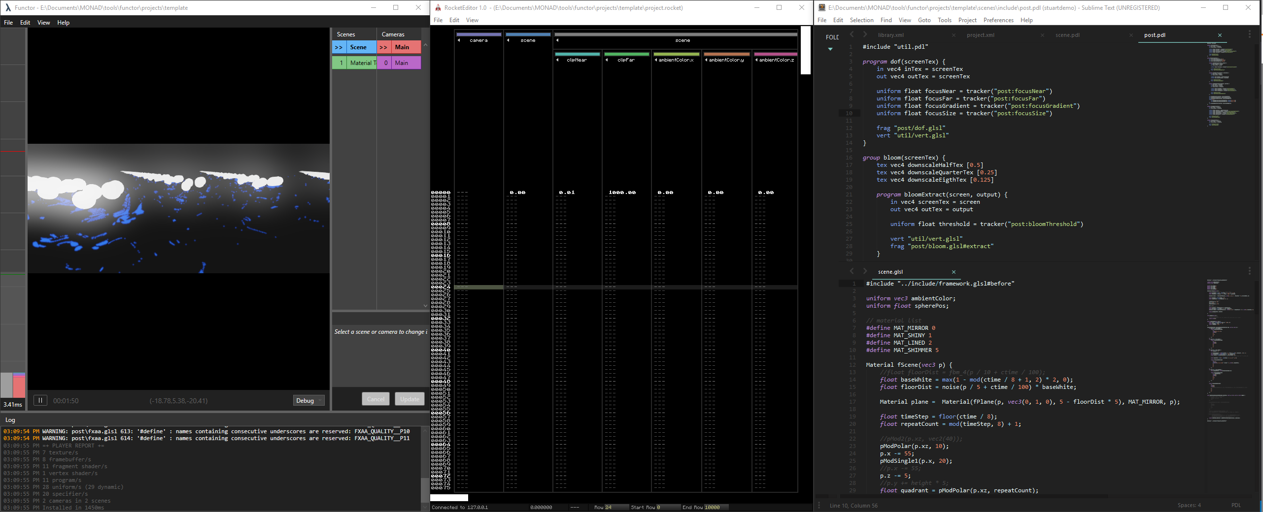 Clockwise; the main Functor window, the Rocket tracker (for animating), PDL code for post-processing, part of a raymarching shader.